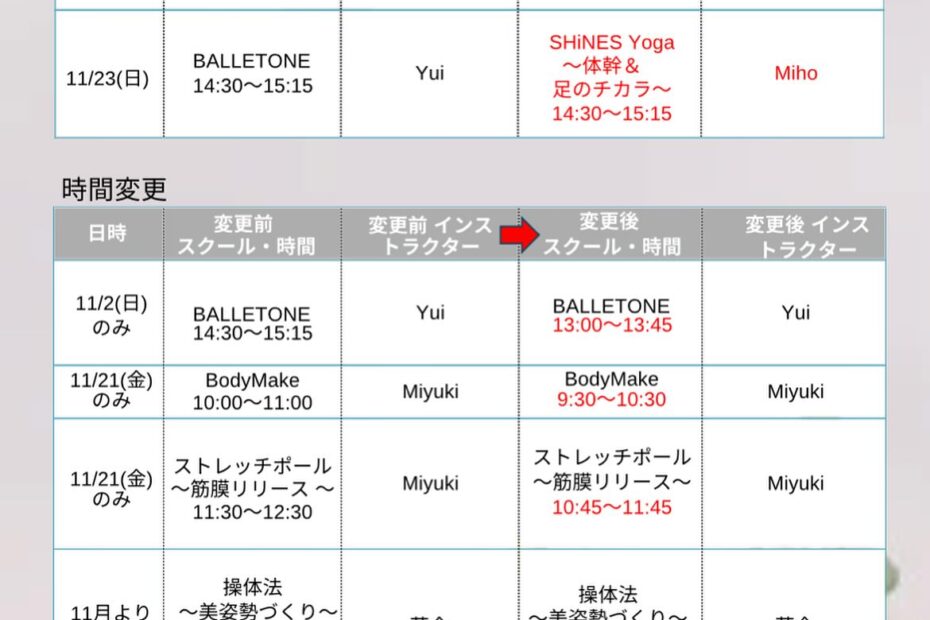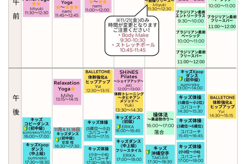2025年11月のスクールスケジュール、スタッフアワースケジュールを更新しました。